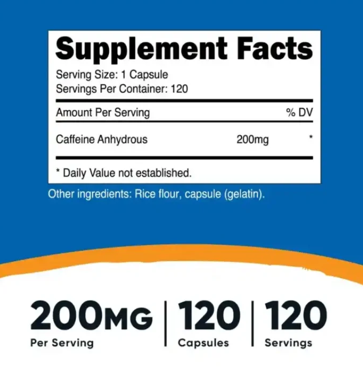 Nutricost Caffeine 200 mg es un suplemento dietario que proporciona cafeína anhidra como ingrediente principal en una dosis estandarizada de 200 mg por cápsula. La cafeína es un compuesto natural que actúa como estimulante del sistema nervioso central, ayudando a mejorar la vigilancia, el enfoque, la energía y la concentración, así como a reducir la sensación de fatiga durante el ejercicio o en situaciones de alta demanda mental. Este producto es útil para personas activas, estudiantes, trabajadores o deportistas que buscan un impulso energético controlado sin azúcares ni calorías adicionales.