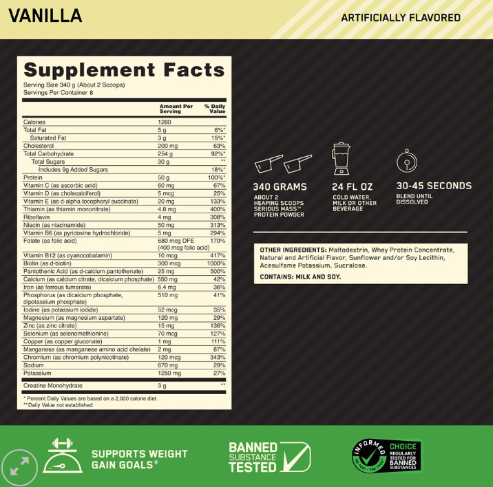 Serious Mass de Optimum Nutrition es un ganador de masa premium diseñado para ayudar a quienes tienen metabolismo rápido o dificultad para aumentar peso.